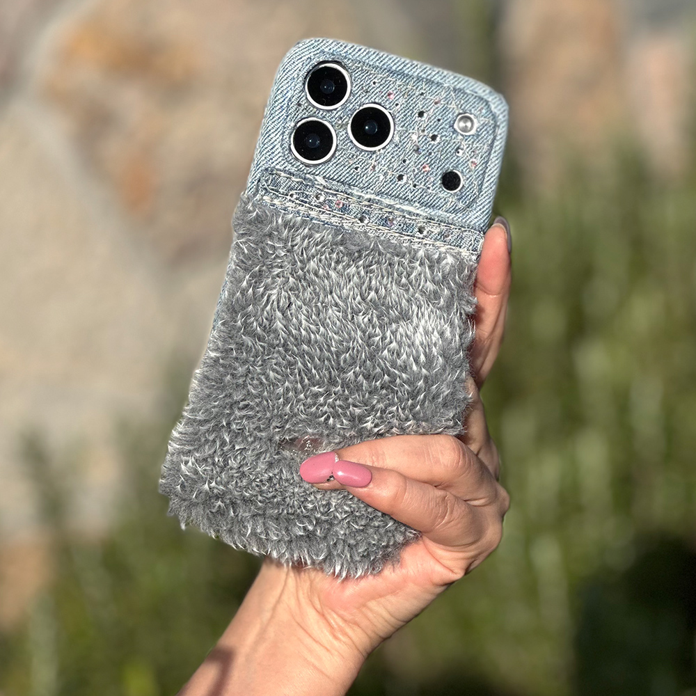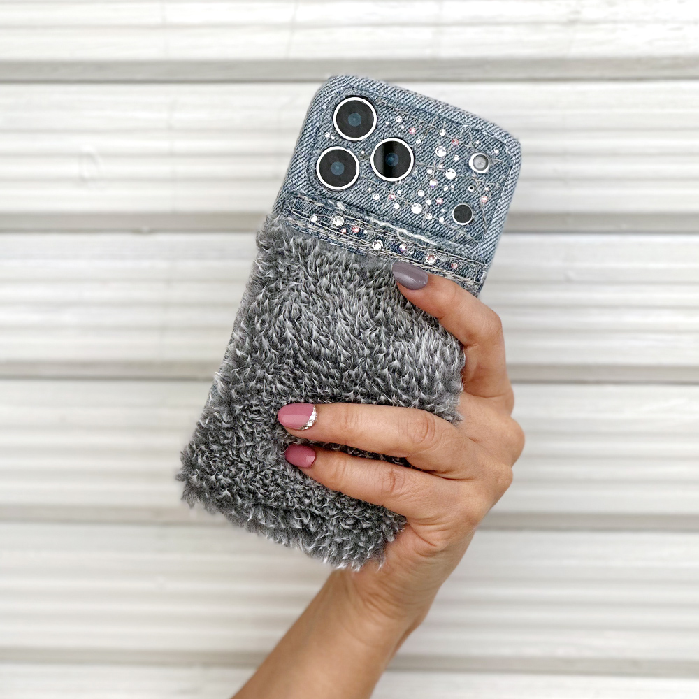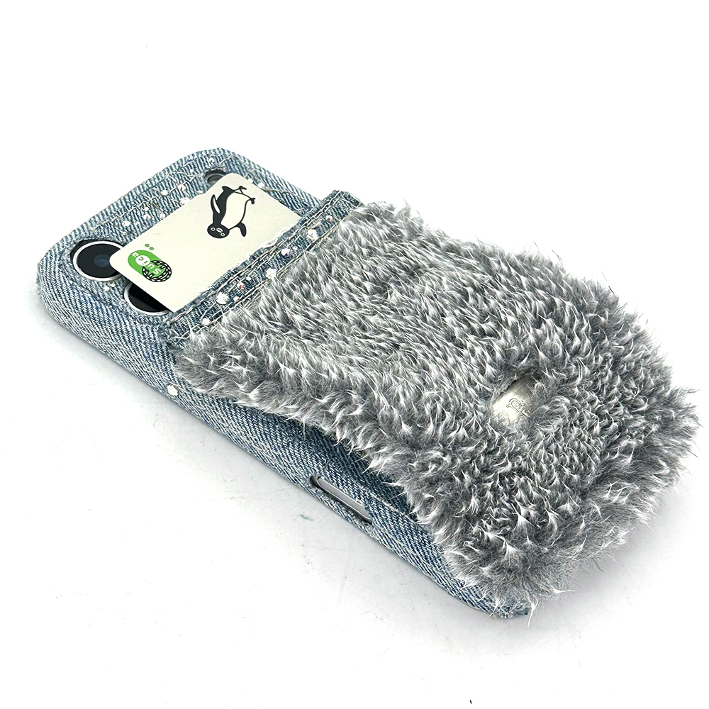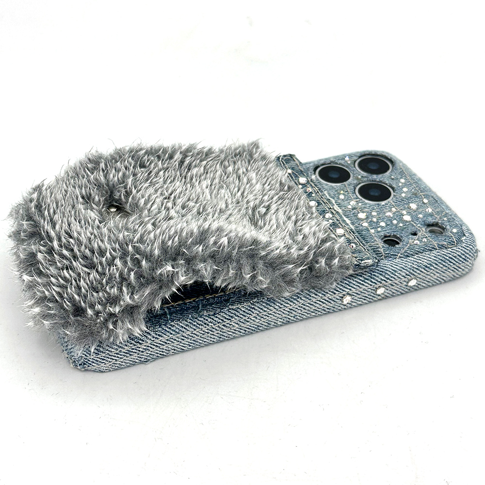 ふわもこのパイルファーのスマホケースと、デニムにスワロフスキーをちりばめたタイプをベースに、お客様のご希望を取り入れてお作りしたアレンジケースです。