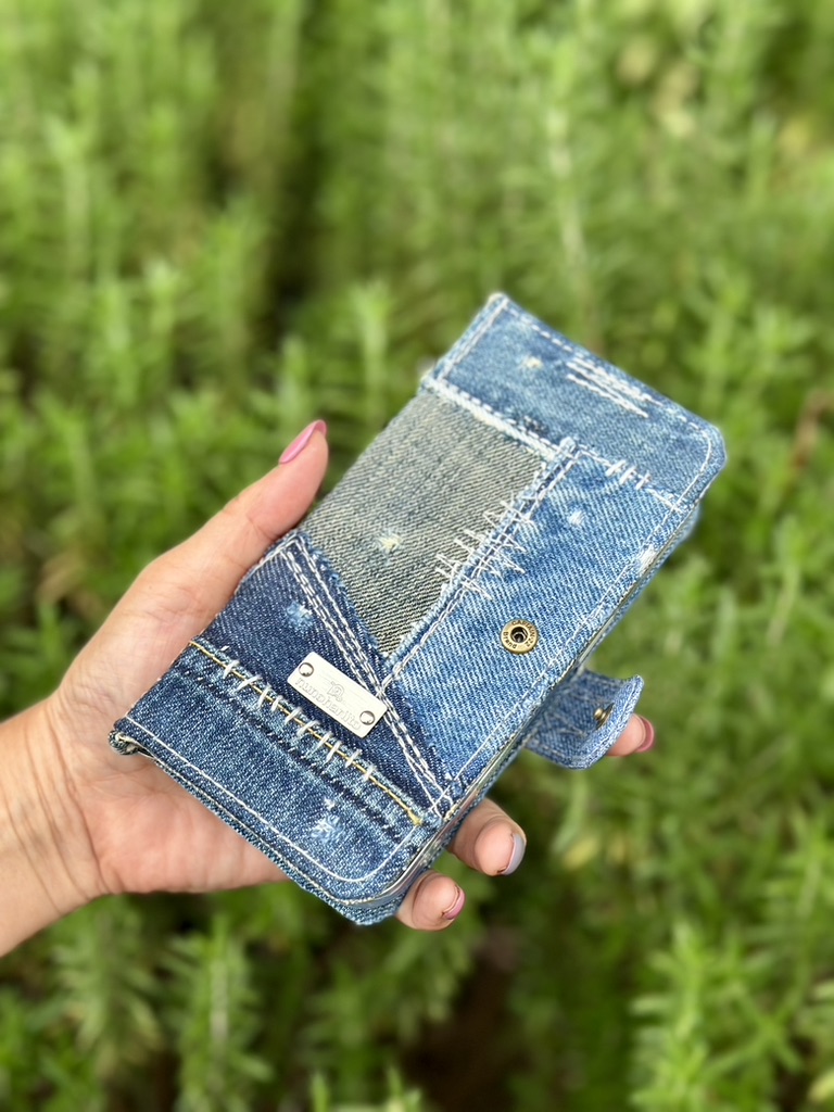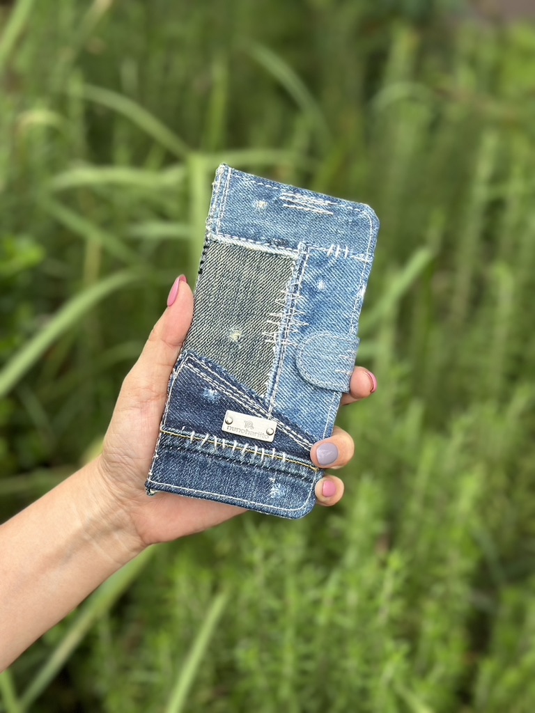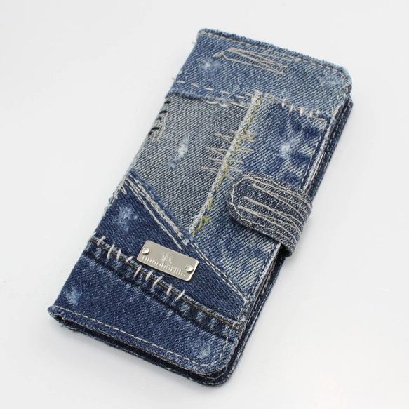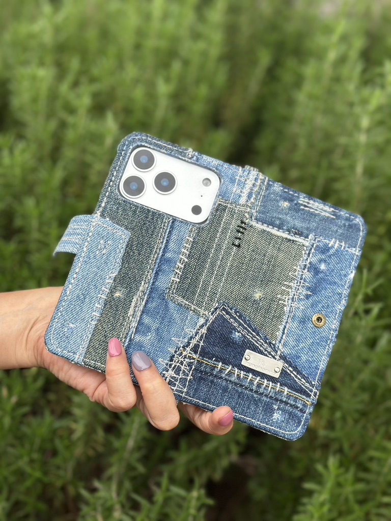 濃淡のインディゴデニムをコラージュした、味わい深い手帳型ケース。長く使い込んだようなヴィンテージ感と、ダメージの風合いを楽しめます。