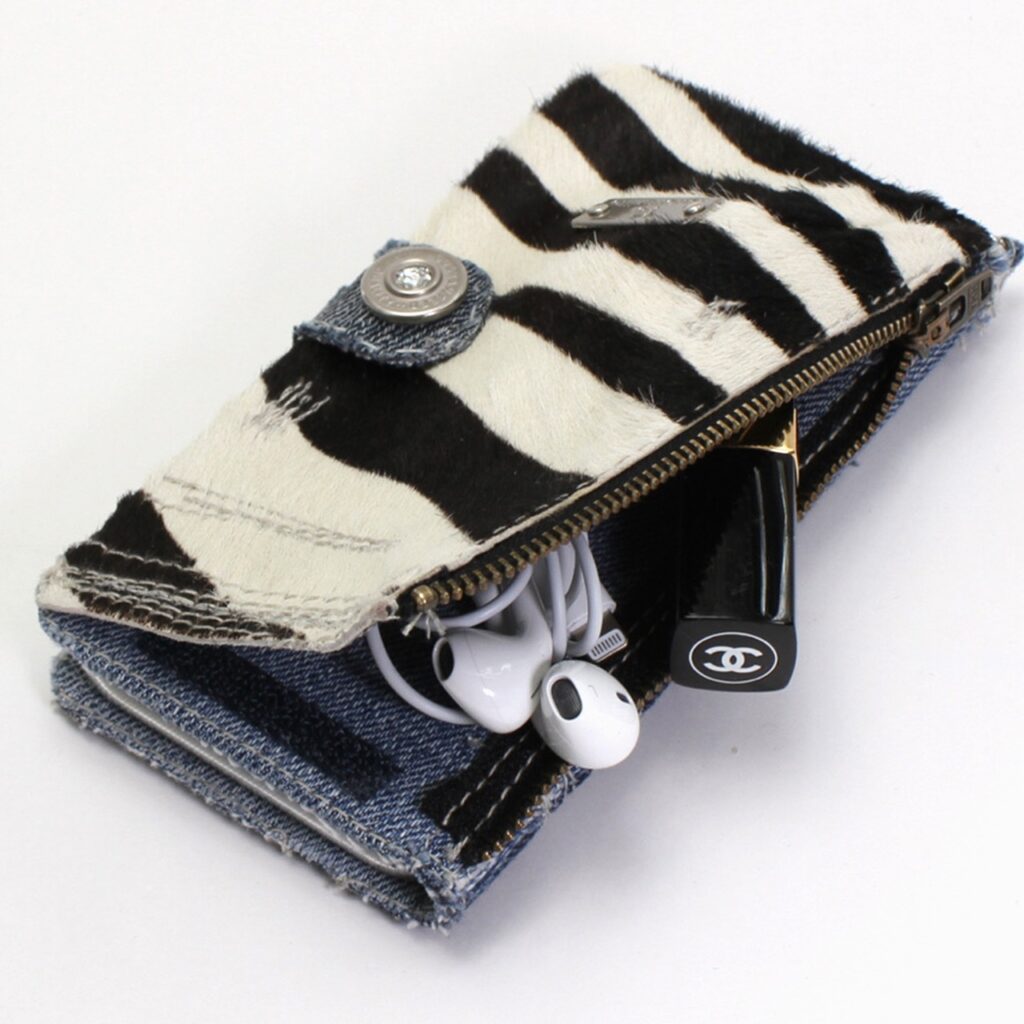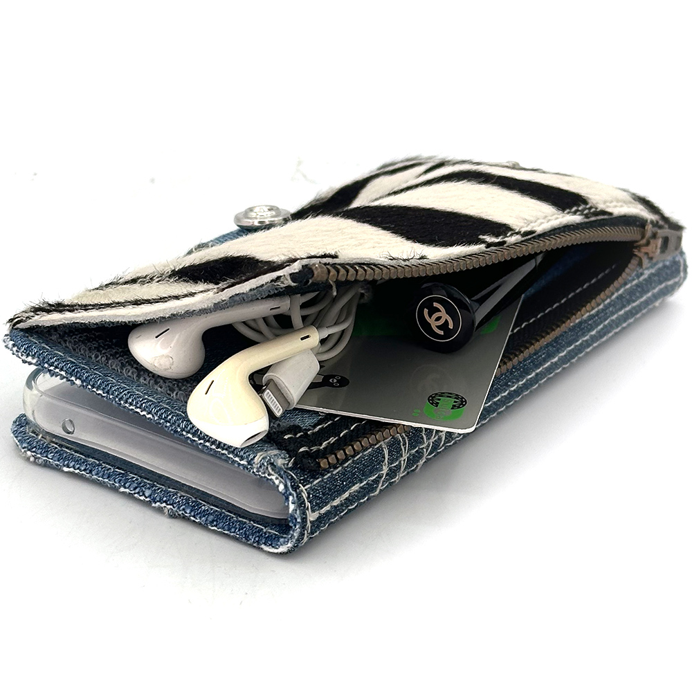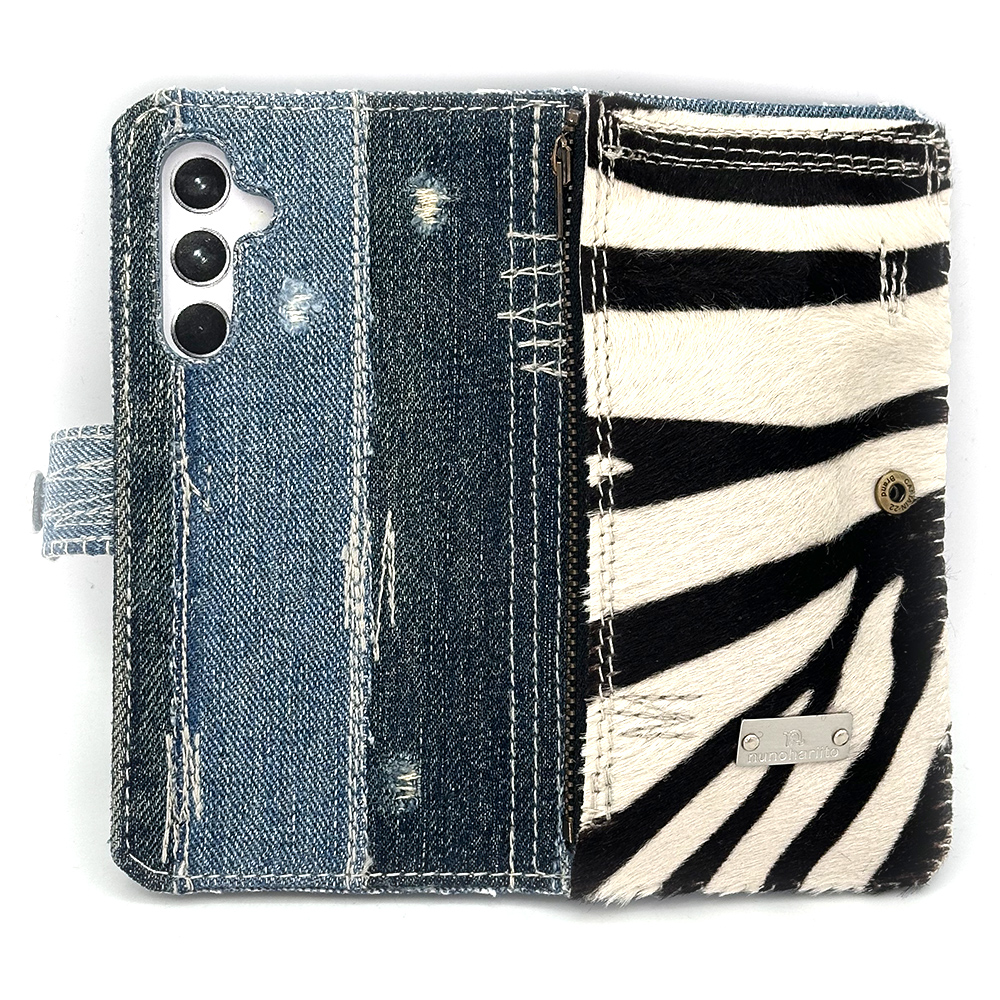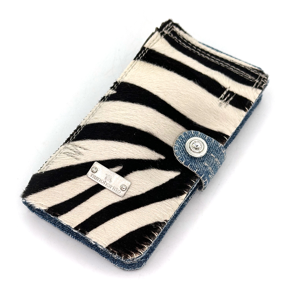 天然ホルスタイン柄のリアルファーとデニムを組み合わせた、ワイルドでナチュラルな雰囲気の手帳型スマホケースです。